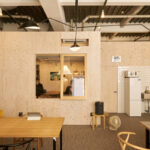 オンライン会議や社内打ち合わせに対応する個室には、室内窓を設け、スタッフ同士の様子が自然に伝わるよう工夫しました。閉塞感を抑えながら、コミュニケーションの取りやすさと集中できる環境の両立を図っています。